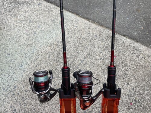 薄暗くなるタイミングで、湾内でもまずは少し沖のポイントからサーチ。ポツポツとケンサキイカが釣れ始まりますがどうも薄い感じ。そして満を持して湾奥へ移動すると大当たり! 水深23mですがケンサキイカの群れは表層に! イカメタルといえばカウンター付きのリールで中層を狙うのですが、ここ雄勝女川エリアではケンサキイカの群れが回って来ると状況次第ではほぼ表層にも浮きます。浮いたイカはエギで、しかもデカイヤツをサイトで狙い撃ちして釣ることもできます。しかし浮いたイカに翻弄され時間ばかりが過ぎて「イカは居るのに抱かない!」となることも。しかしそんな時、やる気のあるイカはその下に居ることは数回の前釣行で確認済み。自分はヤリイカで使い倒して大好きなウキウキトップのスピニングロッド、シマノ「セフィアXRメタルスッテS68UK-GS」で水深3~5mを狙い撃ちします。ちょうど仕掛けが船の上から見えなくなる水深、そこが入れ乗りの水深です。