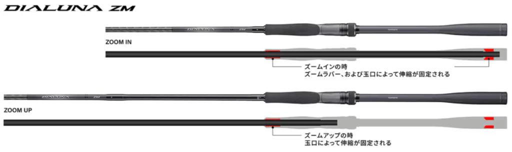 最大の特徴は、ロッドの長さをシーンに応じて切り替えられるズーム機構。これにより、近距離のテクニカルな釣りから遠投が必要な場面まで、1本で幅広く対応することができます。