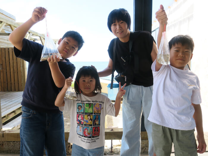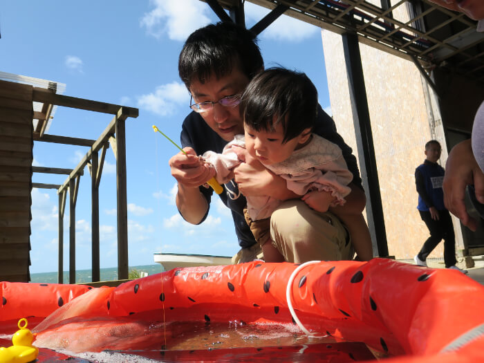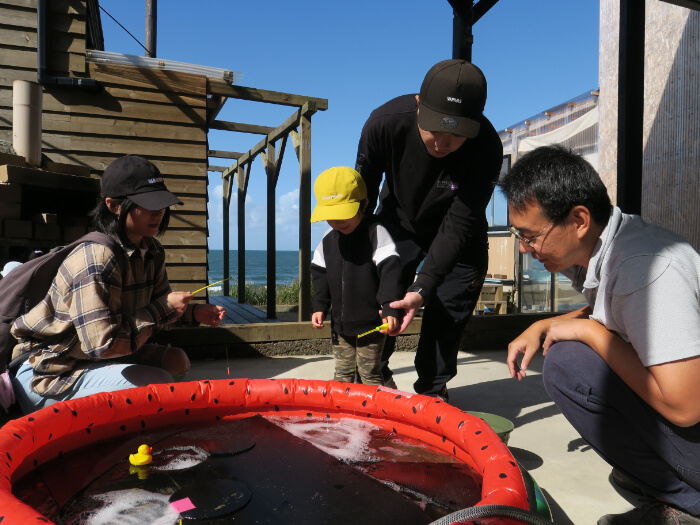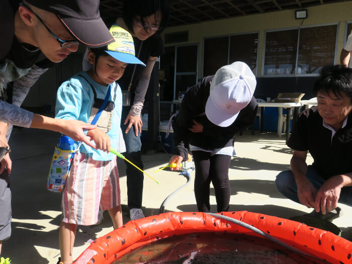 「デトサウナ」で開催されたハゼ釣り堀は初の試みながら多くのファミリーが挑戦し、簡易プールに泳ぐおよそハゼを釣り終始盛り上がっていました。生きているハゼを見るのも初めて、まして釣るのも初めての皆さんは釣りの楽しさを満喫していました。釣り上げたハゼは「八千代荘」で調理してもらい食べることも可能で、釣りたて新鮮なハゼを堪能していました。