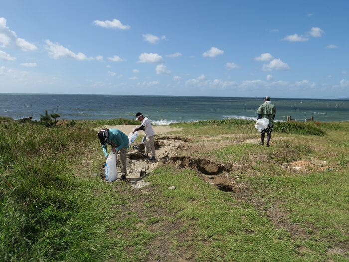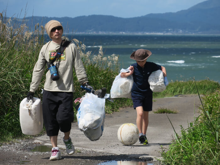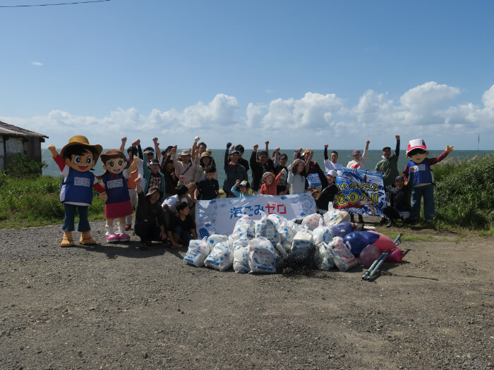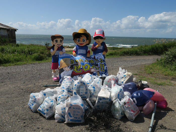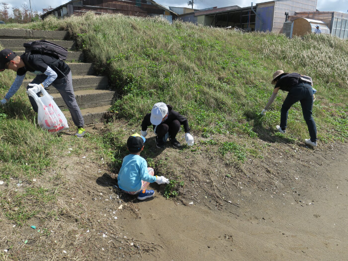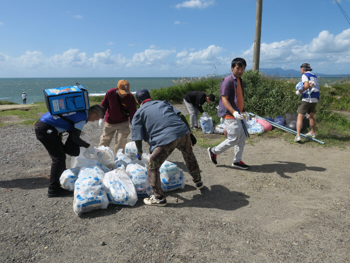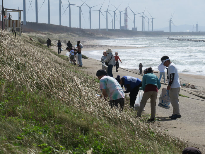午前11時からスタートしたクリーンアップには40名の参加者が集まり、強風のなか出戸浜海水浴場付近のゴミを熱心に集めていました。ゴミの種類は、ペットボトル、発泡スチロールなどのプラスチック系が多く、漁具系のかなり大きな海洋ゴミも重そうに持ってこられる参加者もおりました。