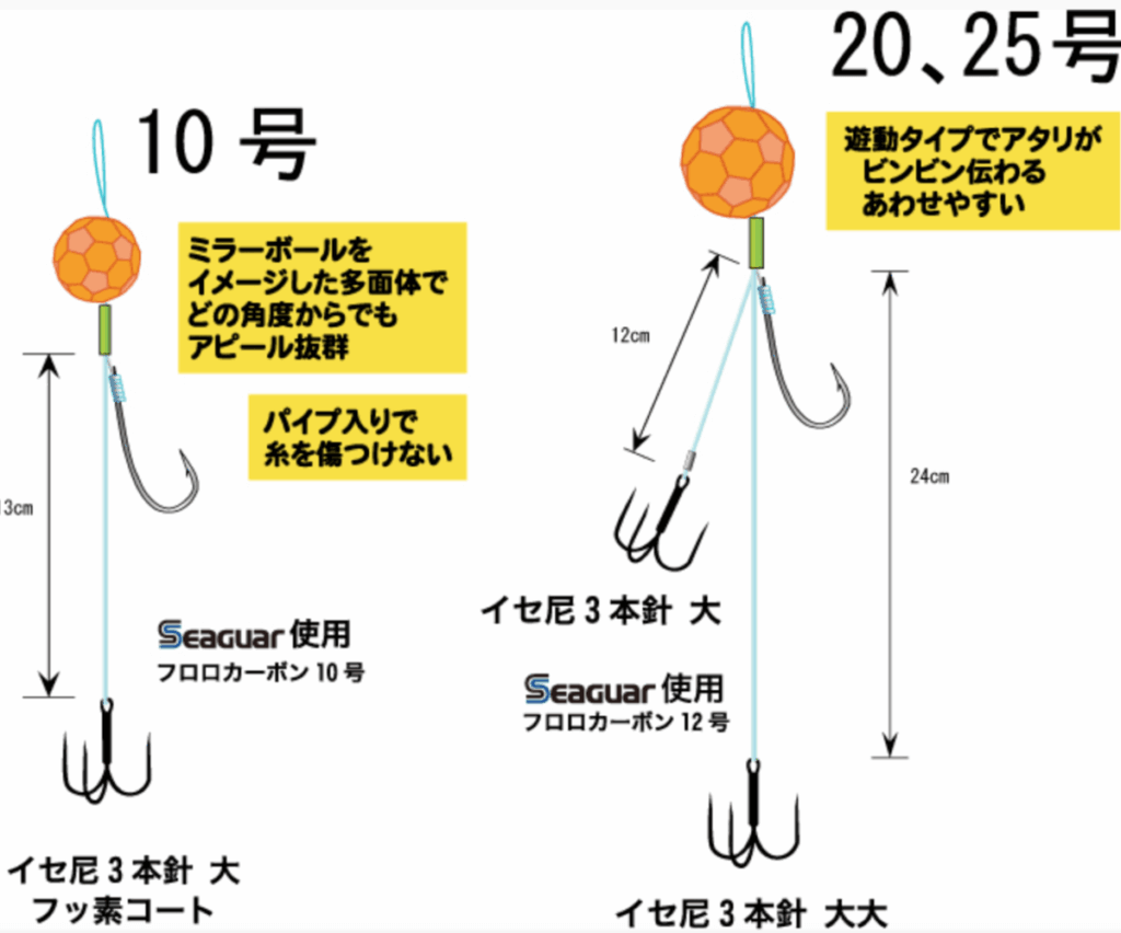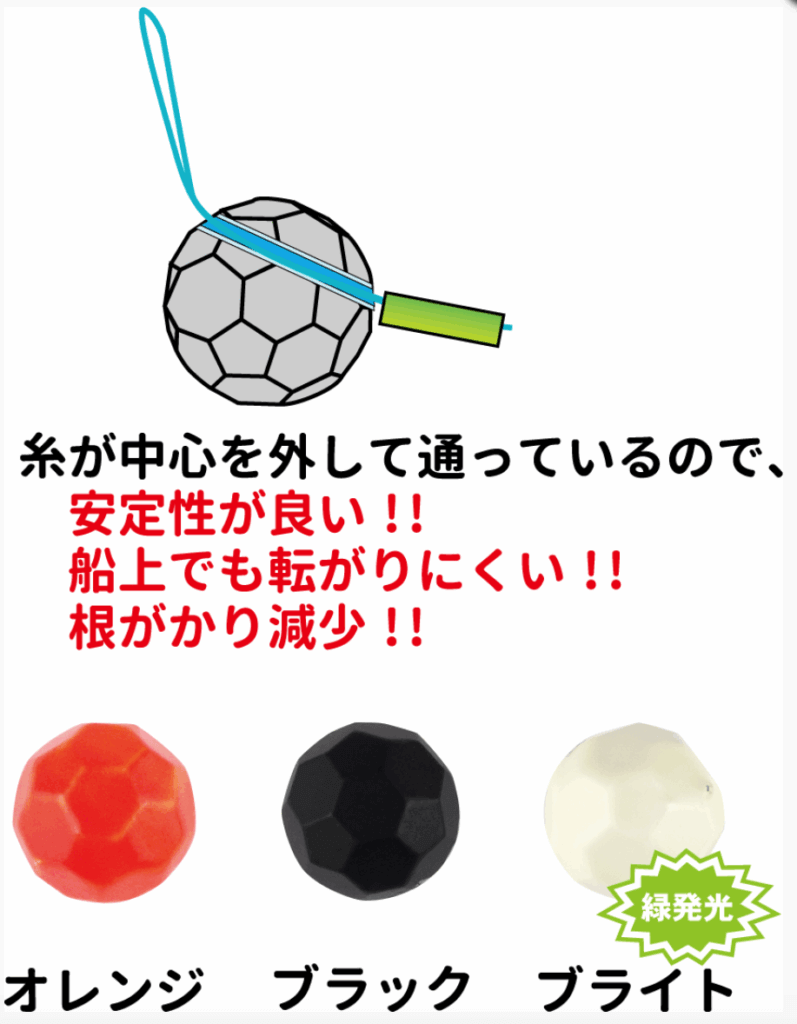 「ふぐ遊動カブラ仕掛け」の最大の特徴は、丸みを帯びた球体形状のカブラオモリ。潮切れが良く、底取りがスムーズにできるため、かっとう釣りの基本である「オモリを安定して底に置く」動作が楽に行えます。また、どの角度からでも視認性が高く、フグへのアピール効果も抜群です。