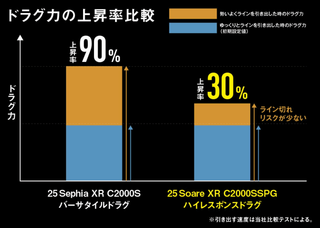 ソアレXRは、ドラグ作動初期の滑り出しが極めてスムーズな「ハイレスポンスドラグ」を採用。魚の突っ込みに対して即座にドラグが反応し、ラインブレイクを防ぎます。特に、食い込みが浅いアジや突発的な走りを見せるメバル相手に、この繊細なドラグ性能が大きな安心感を与えてくれます。わずかなテンション変化にも追従するため、細PEやエステルラインとの相性も抜群です。