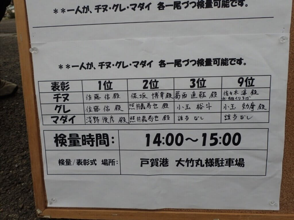 クロダイ部門では、戸賀沖磯【どっけB】で47.5cmの良型を仕留めた佐藤信選手が見事1位を獲得。さらに、同じく佐藤選手はメジナ部門でも34cmを釣り上げ、2冠を達成しました。