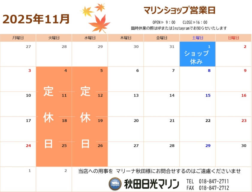 秋田マリーナ内に拠点を置き、船関連の商品を販売する当社WEBスポンサーである秋田日光マリンから11月の営業時間のお知らせが届いている。