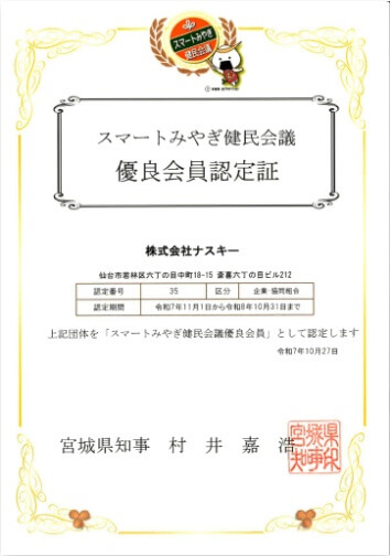 【宮城県】株式会社ナスキー、スマートみやぎ健民会議優良会員に認定!