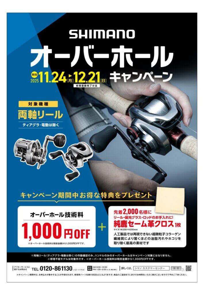 シマノでは現在、両軸リール(ティアグラ・電動を除く)を対象にした「オーバーホール技術料1,000円OFFキャンペーン」を11月24日から実施予定です。