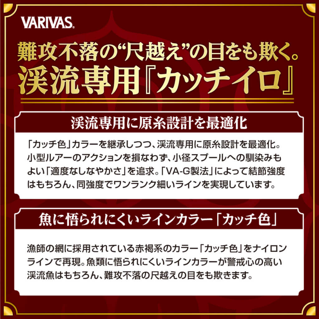 すでに本流用のナイロンライン、「ビッグトラウト」でも実績があるように「カッチイロ」は、ボルドー系の赤褐色をベースにした独自のカラーです。
