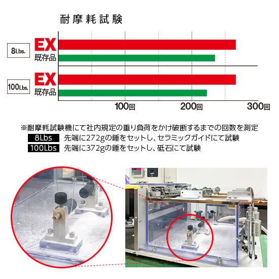 新製法を導入することで、従来品比で耐ショック性能が大きく向上しています。例えば、衝撃試験機で1.8 mから210 gの錘を落下させ、20 Lbsのラインが何回の衝撃に耐えられるかを測定。