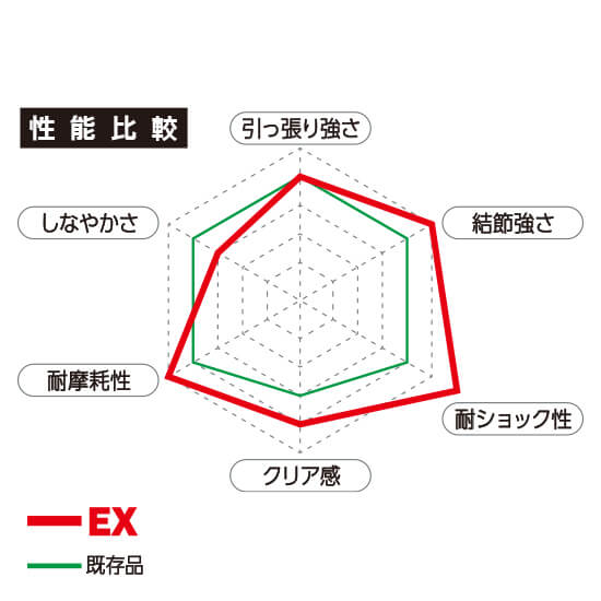結節強力と伸度を掛け合わせた“粘り強さ”も平均で約10%改善。さらに、耐摩耗性も平均約10%のアップというスペックをアピールしています。