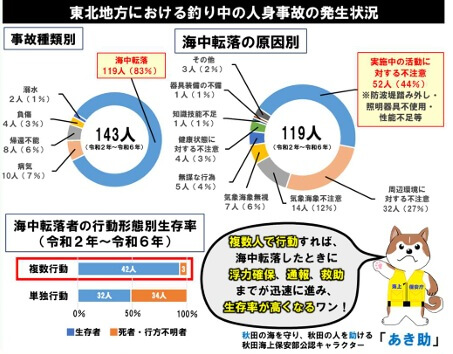 秋田海上保安部では、釣り人への安全指導や、地元のラジオ番組に出演し、広く県民の皆様に対して事故防止を呼び掛けてまいります。釣り中の事故防止のポイントやマナーを守り、事故やケガ、トラブルが無いよう釣りを楽しんでください。