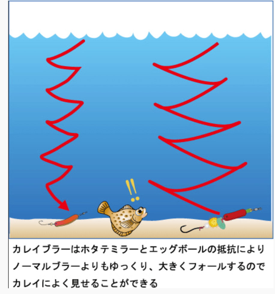 「カレイブラー」最大の特徴は、ホタテミラーとエッグボールによる水中抵抗。 これにより、通常のブラーよりも 落下スピードがゆっくり、さらに 大きなフォール軌道 を描きます。