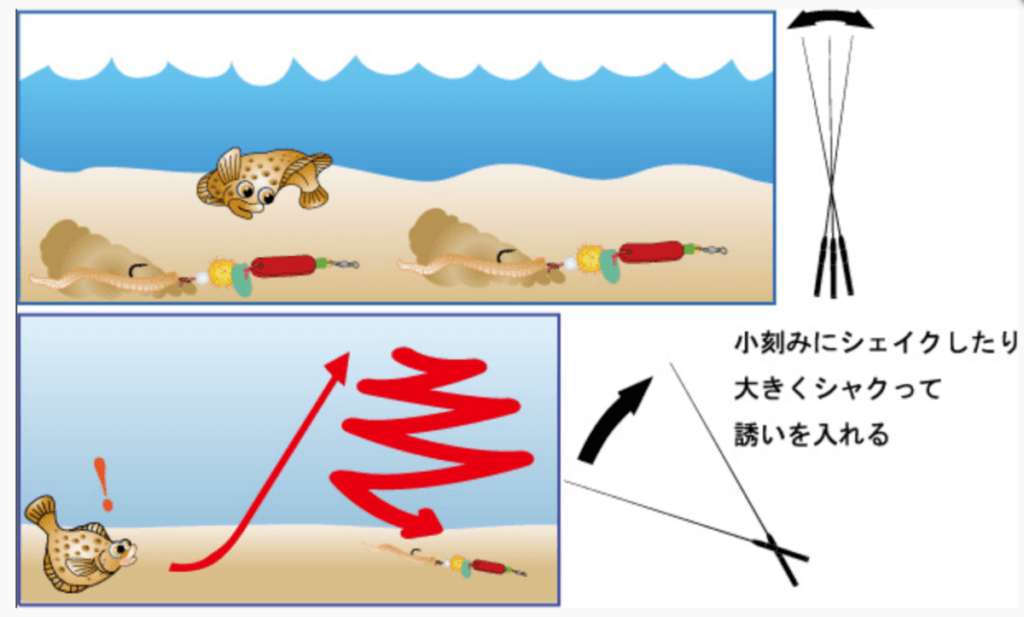 着底後は、ハゼやキス釣りのように ゆっくりズル引き したり、ロッドを 小刻みにシェイク して細かい砂煙を立ててアピールするのが効果的。