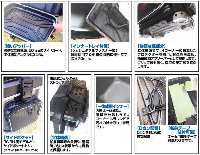 RH(ロッドホルダー付) は、ホルダー付きでロッドの固定を前提とした運搬・保管に便利なタイプ。複数本ロッドの持ち運びや、ボート・防波堤などでの移動釣行時に重宝します。