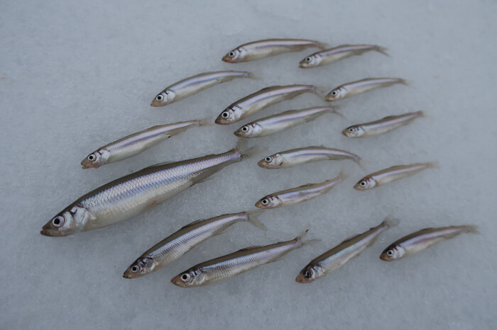 〈北塩原村〉桧原湖のドーム船では5~12cmクラスが1人0~506匹。ワカサギ用5~7本針仕掛けを使用し、エサはアカムシ、ベニサシ。