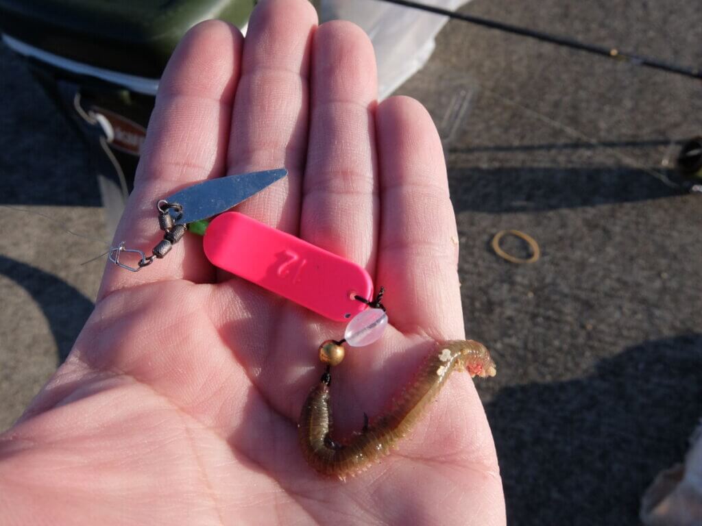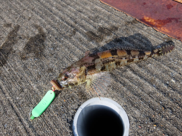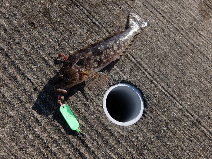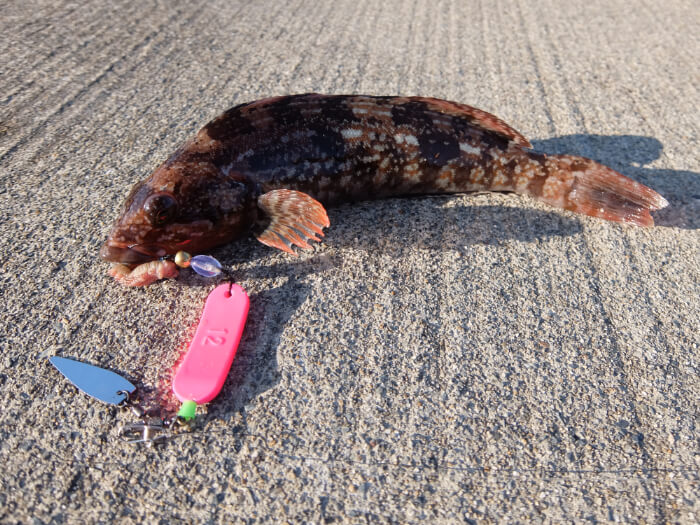 次なるポイントはやや湾外の水深のあるエリア。水深は3~4mくらいありそうだったので「ブレードブラー」12gを投入。セオリー通り足下へ落として狙うと速攻でバイトがありアワセも決まりヒット! さすが三陸の海は豊かだなあと感心して魚を抜き上げると正体は小さいながらアイナメ(嬉)。