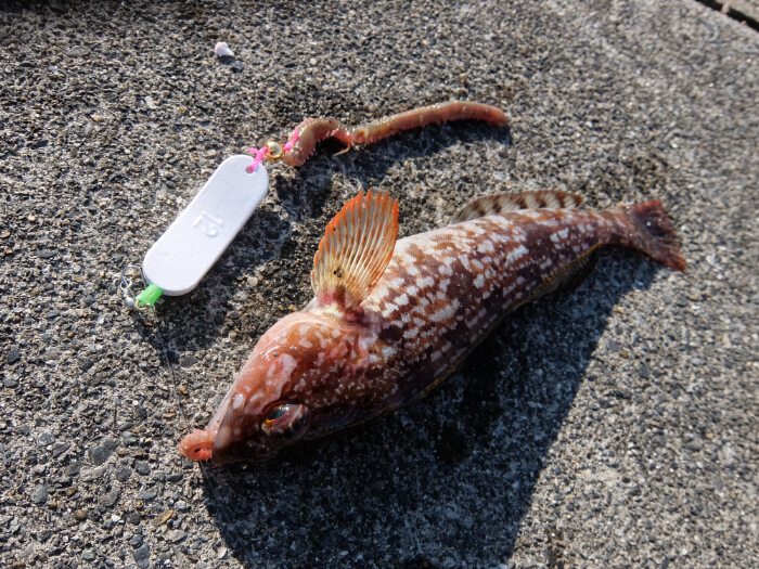 幸先良くアナハゼを釣ったので、次は隣の穴を狙うが反応なし…。テンポ良く次から次へ穴を攻めると再びバイトがありヒット! 今度もイイ引きでラインが擦れて切れそうになるほどだったが何とか無事にキャッチ。ギリギリ穴から抜けるサイズのクジメが正体を現した。その後も適度にバイトがあり楽しむことができハッピーエンドとなった(幸)。