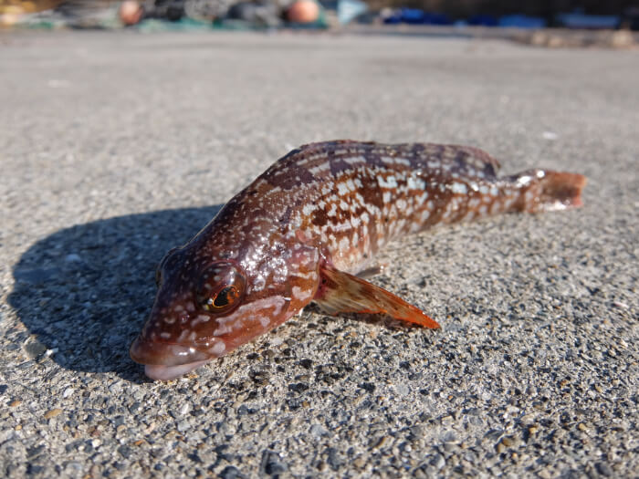 穴釣り用のタックルも車に積んではいたのだが、アタリがあるか分からないのでまずはそのままアジングタックルでやってみる。ブラーを慎重に穴に落として底まで沈めると…。何といきなりバイトがありヒット! 新しい釣りのヒットは超絶嬉しいので慎重に抜き上げる。正体は三陸らしいアナハゼ! なかなかの引きだったので、もしかしたら穴に引っ掛かるのでは? と心配になるほどの良型!