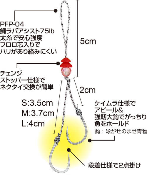 大きなフックサイズの ビッグツインアシスト により、口の大きな魚でもしっかりフッキング。マダイはもちろん、ハタ類など 大型ターゲットにも対応 します。