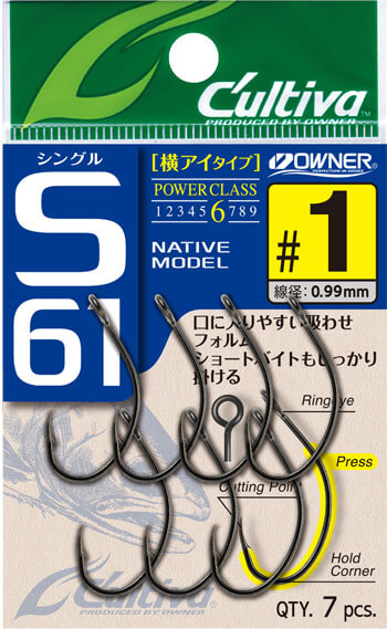 「S-61 シングルフック61(サクラマススペシャル)」はその中でも、掛かり・保持力・強度のバランスに優れたモデル。キャッチ率を高めながら、リリース前提の釣りにも配慮したフックです。