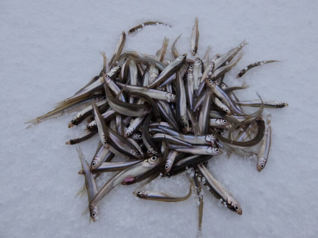 〈湯沢市〉桁倉沼、田螺沼では氷上穴釣りで5~10cmクラスが1人0~154匹。胴突き5~7本針仕掛けを使用し、エサはベニサシ、白サシ。