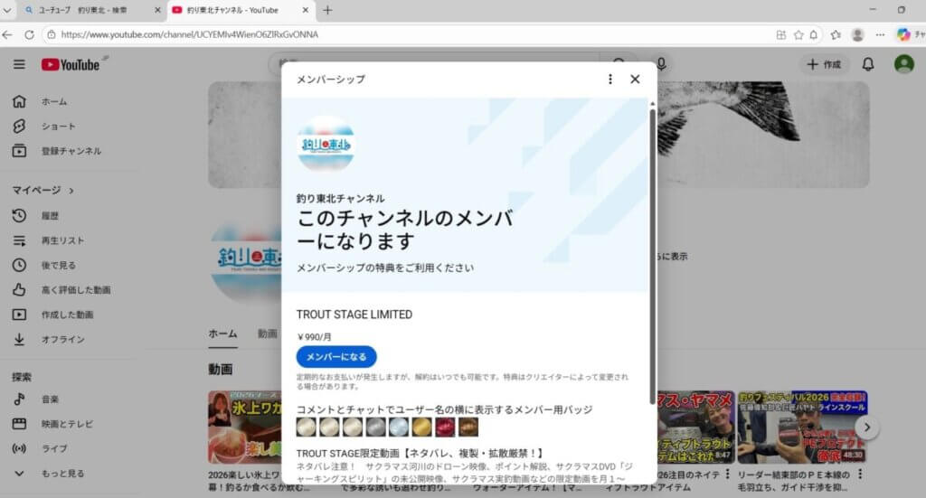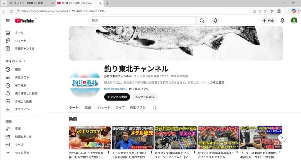 1、釣り東北YouTubeで検索、釣り東北のYouTubeチャンネル(トップ)を表示してください