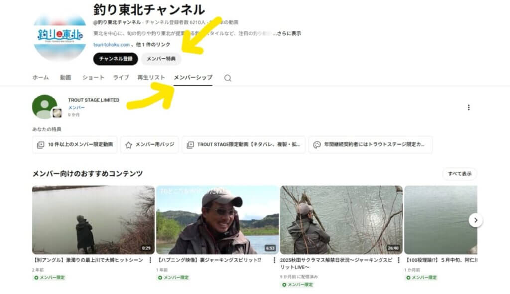 4、契約後は登録アカウントでログインした状態でYouTubeを開き、メンバー特典、メンバーシップを選択すると特典動画が視聴可能になります。契約後はスマホ、iPhoneでも視聴可能です。こちらもYouTubeアプリから登録ログインが必要です。