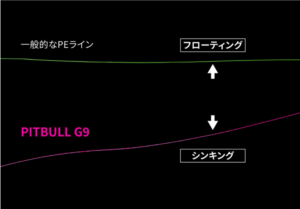 一方、「ピットブル G9」は約1.13〜1.27の高比重設計。これは水よりも重く、ライン自体が沈みやすい数値です。