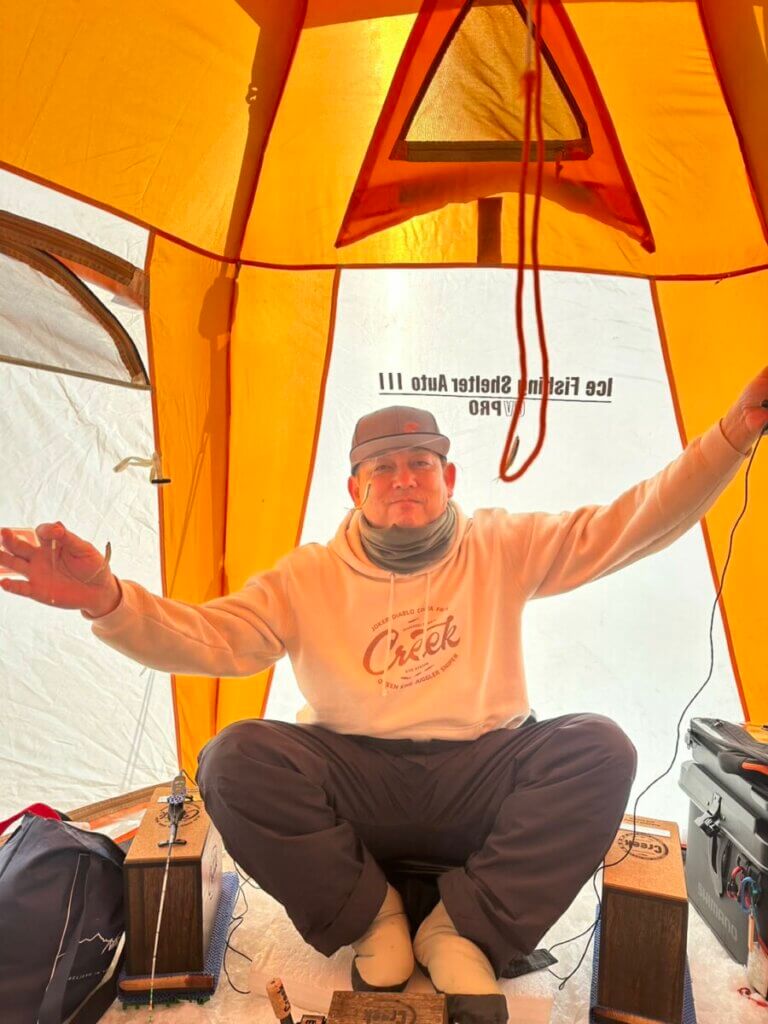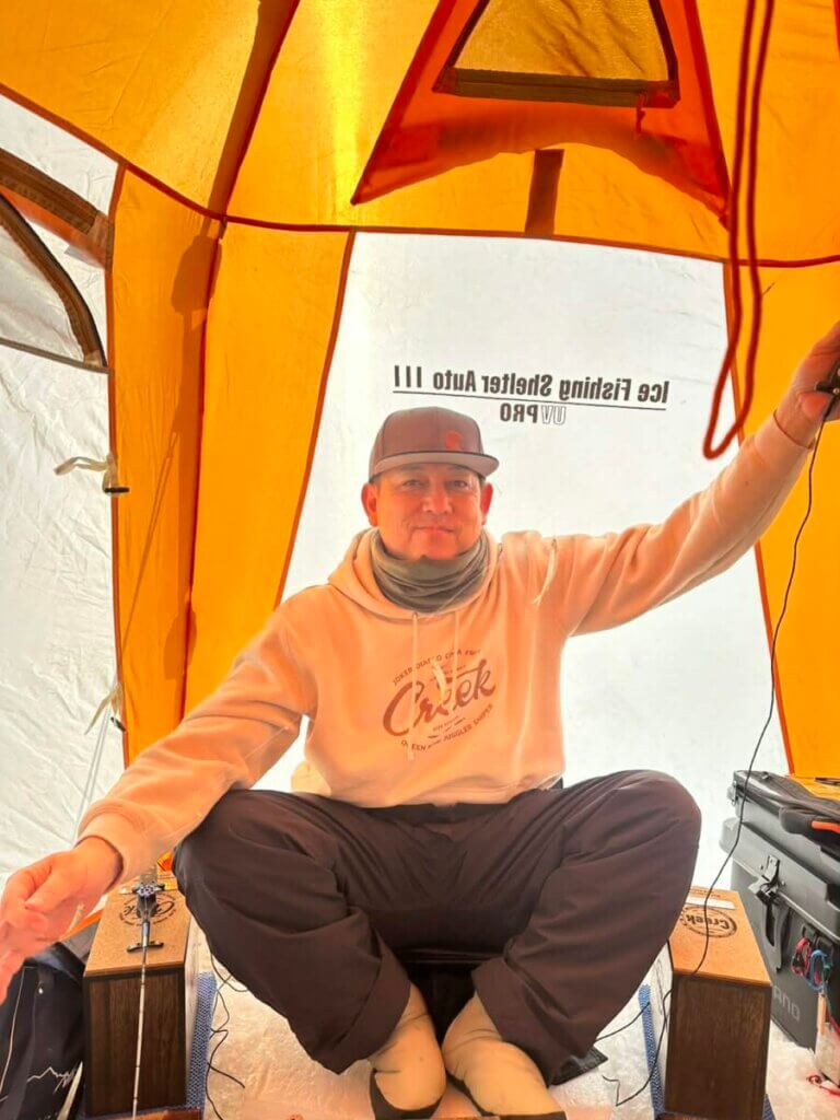 2月15日開催「岩洞湖氷上ワカサギ釣り(ペア)大会」で、見事な優勝を飾った田辺・南ペア。田辺さんになぜ浅場に入ったのか、どう釣ったのかを徹底的に解説していただく