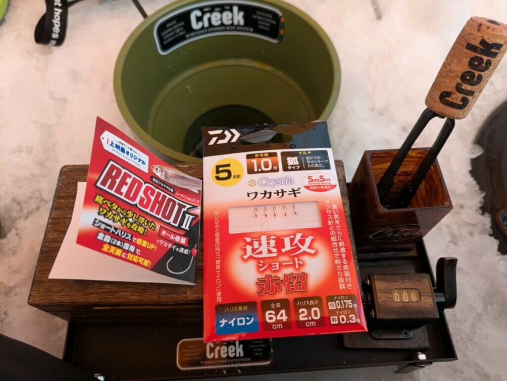 今回は上州屋の仕掛けを使うレギュレーションがあったため、フロロカーボンで短エダスの「レッドショットⅡ(フロロ)」を選択しました。岩洞湖ではフロロを使う人が少ないと聞きましたが、今回の浅場では逆にその硬さが効きました。