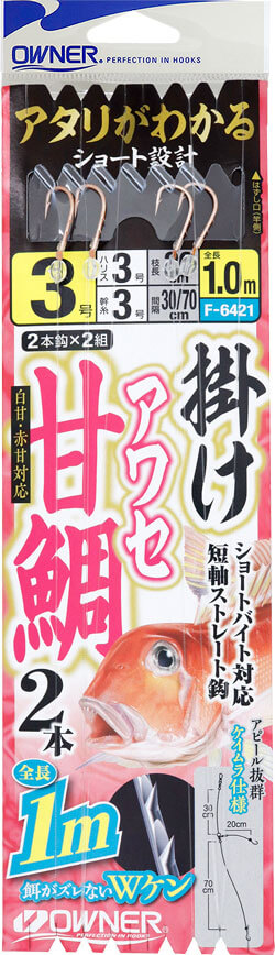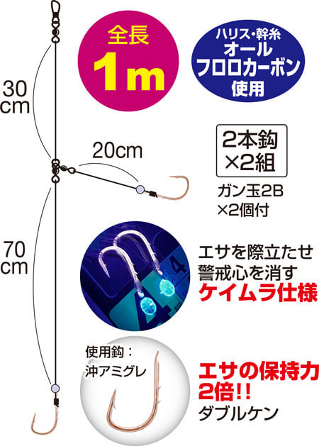 「掛けアワセ甘鯛2本」は、オーナー「沖アミグレ」を使用した2本針仕様、全長1mのアマダイ仕掛けです。針先は即アワセ対応のストレート形状で、ダブルケン仕様により、アオイソメやホタルイカなどボリュームのあるエサをしっかりホールドできます。ケイムラでアピールもバッチリ!
