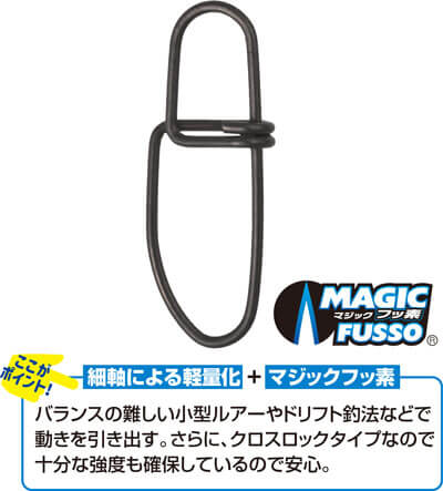 カルティバのライトクロスロックスナップは、クロスロック構造の高い信頼性をベースに、ライトワイヤー化によって扱いやすさを高めた“ありそうで無かったライト仕様”。さらにマジックフッ素による摩擦軽減によって、ルアー本来の動きを引き出しやすい設計となっています。